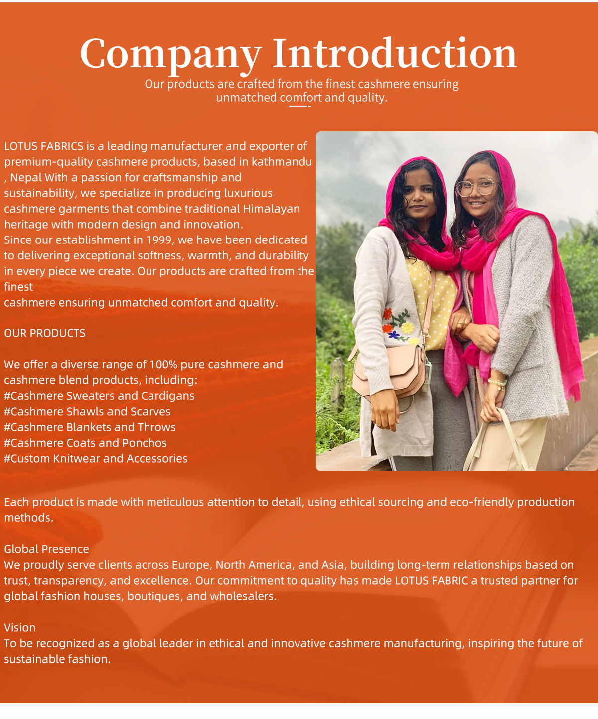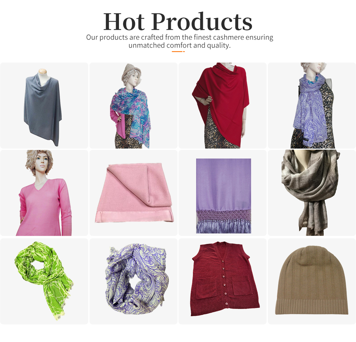 Principais produtos:Xaile pashmina, suéter pashmina, cachecol pashmina, pulôver pashmina, pancho pashmina (cashmere)